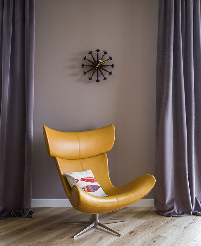 Изначально хозяева квартиры склонялись к светло-бежевому цвету в качестве основы, но совместная поездка на Миланскую неделю дизайна пошла на пользу проекту. Заказчики полюбили более интенсивные, насыщенные и глубокие цвета.