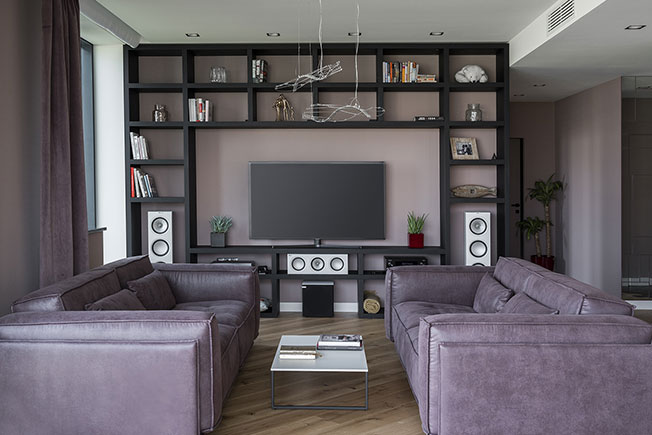 Гостиная.Телевизор Samsung. Профессиональная акустическая система компаний Denon и KEF. Диваны «Фабрика 8 марта»,