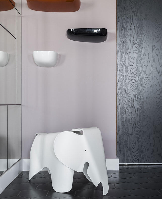 Прихожая. Фигура слона — сиденье и интерьерная скульптура, икона дизайна. Создана Чарльзом и Рей Имз в 1945 году. Сегодня объект выпускает компания Vitra.