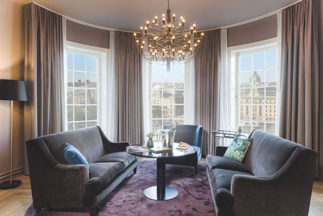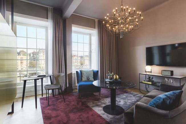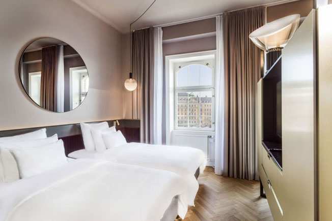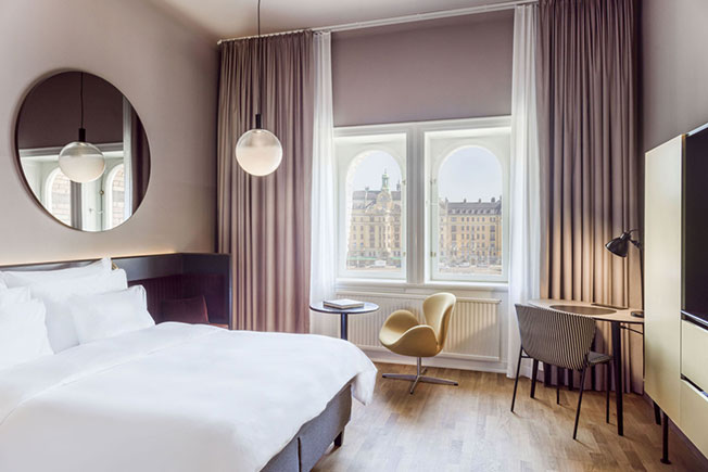 В 170 номерах прослеживается тема круга — повсюду круглые зеркала и светильники-шары Zero Lighting. Из арочных окон открывается вид на гавань или импозантные здания главной улицы Стокгольма.