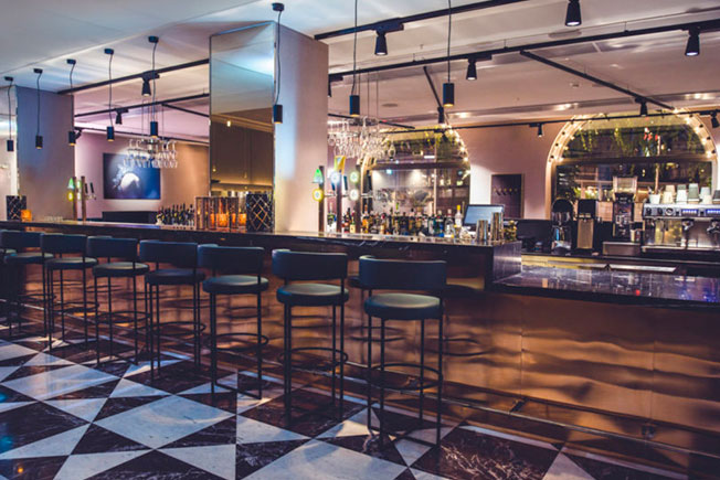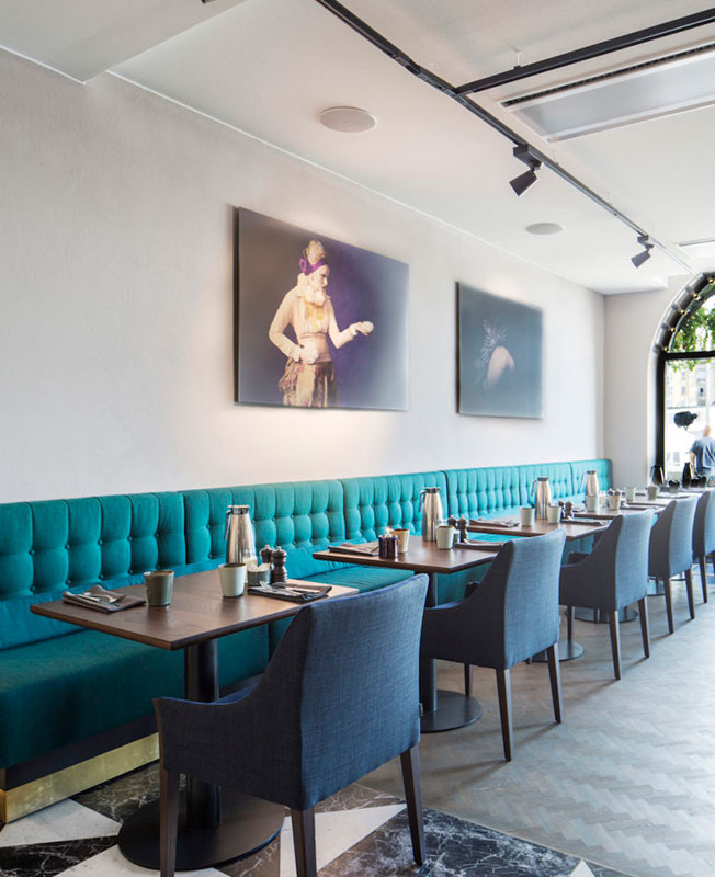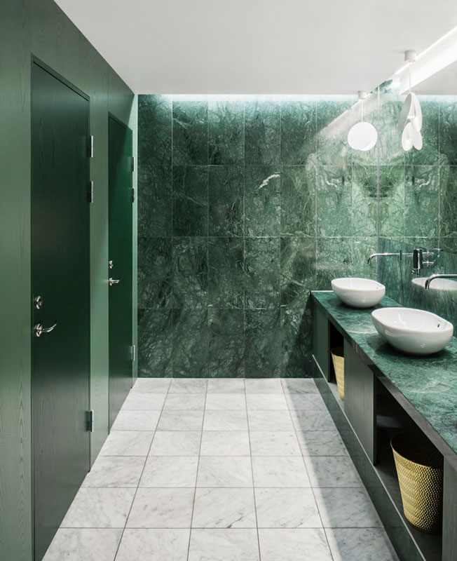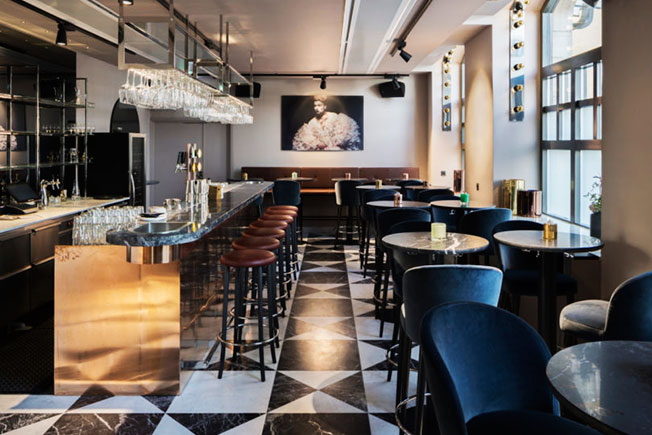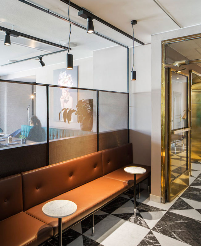 Проектировщики создали скромный холст для выдающихся деталей, таких как черно-белый орнаментальный пол в ресторане (он родился под влиянием мавританского стиля соседней торговой галереи Birger Jarlspassagen), как напольного светильник Майкла Анастассиада для Flos, кресла Арне Якобсена для Fritz Hansen или красочные произведения местных художников Клары Г и Изабеллы Стол.