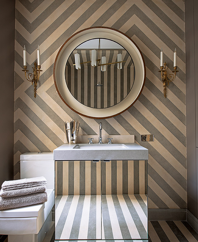 Апартаменты начинаются с холла прихожей, отделанного каррарским мрамором и декорированного винтажной модернистской консолью, позолоченной металлической банкеткой, лирическим женским фотопортретом, черной и белой керамикой, круглым подвесным плафоном из плексигласа 1960-х годов и зеркалом «рыбий глаз» в медной погнутой раме. За масляным портретом XVIII столетии скрывается потаенная дверь в гардеробную. Здесь уже задан основной тон интерьера – утонченная эклектика с нотками ар-деко.