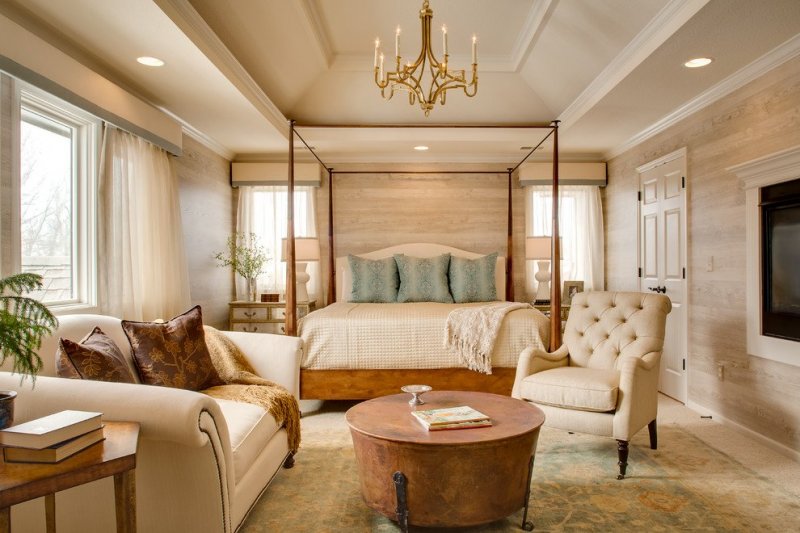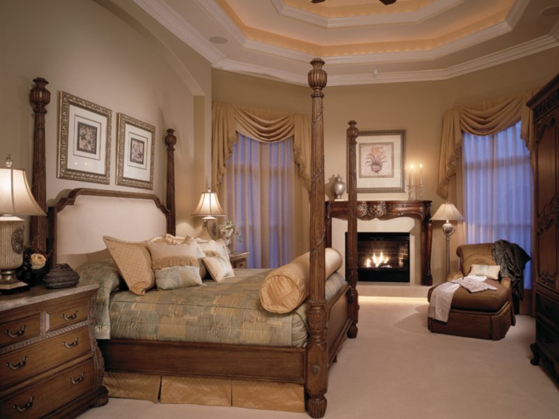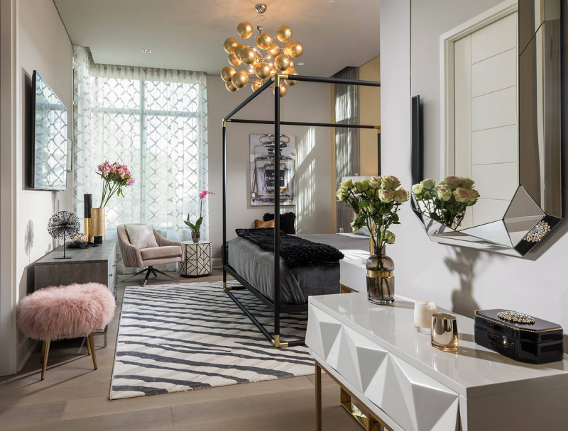 Гламурное оформление не может нарушать уют или снижать уровень комфорта. Напротив, пестрое сочетание красок способствует нормализации настроения. Предпочтительно, чтобы кровать была большого размера с изголовьем нестандартной формы, имела декоративные элементы (стразы и т. п.). Украшением всего интерьера станет ложе круглой формы из кожи. Дополнят романтическую обстановку покрывала, имитирующие шкуры животных. По обе стороны от кровати обычно выставляют пару глянцевых тумбочек. Разнообразят интерьер трюмо (туалетный столик) и пуфы. Зеркало с софитами будет выполнять роль точки фокусировки. В последнее время популярны напольные зеркала. Завершить оформление нужно установкой вместительного вещевого шкафа. Стены украшают металлическими и цветными фоторамками. На пол кладется ковер небольшого размера. Лучшие текстильные материалы для оформления спальни: