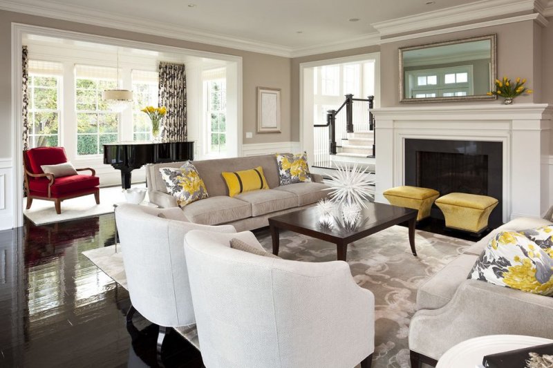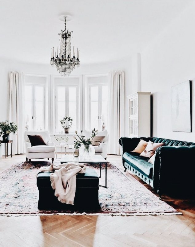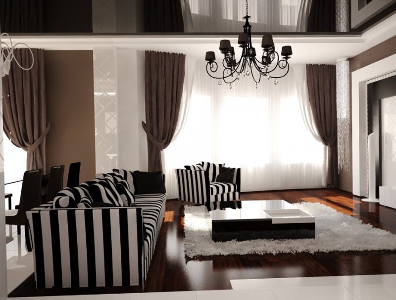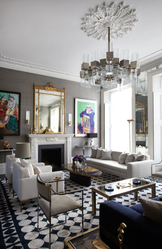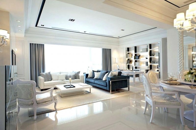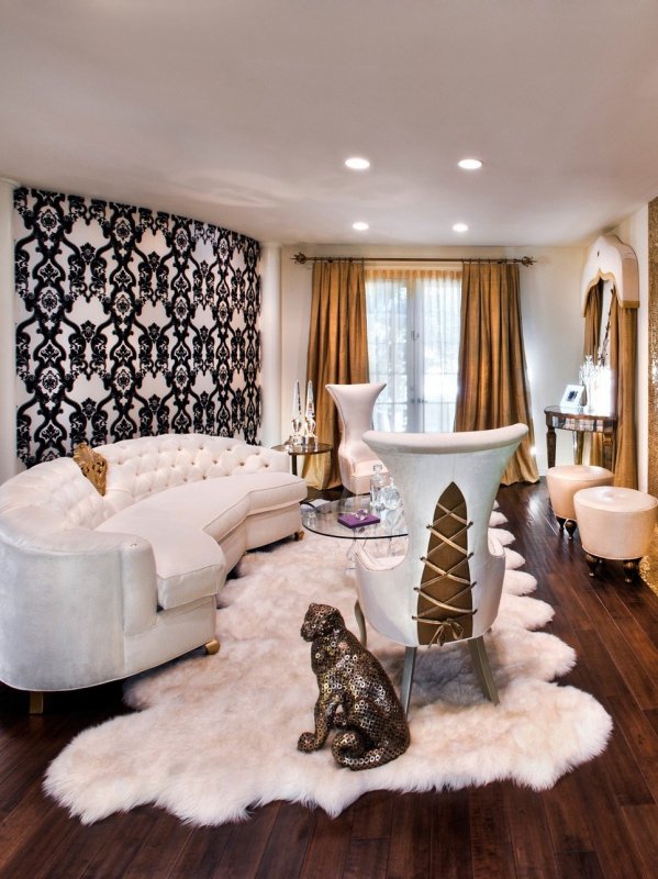 Зал это та комната, где предпочтение всегда отдавалось «классике». Это невысокие ножки, округленные подлокотники, кресла и диваны с велюровой или кожаной обивкой. Среди разнообразия цветов стоит выделить голубой, розовый, серебристый, золотой, а также окрас, стилизованный под шкуру леопарда. Украсить комнату можно разноцветным журнальным столиком, отделанным полудрагоценными камнями, такими как яшма и малахит. Не стоит избегать классических приемов декорирования: пуфов, напольных торшеров, большого количества декоративных подушек, канделябров, дорогих фарфоровых ваз, ширмы, типичных аксессуаров библиотек и кабинетов. Приветствуются смелые решения — выделение большой площади под зеркала, их размещение под прямым углом. На пол кладутся ворсистые покрытия, а также ковры, имитирующие шкуру дикого животного. Профессиональным фотографам стоит задуматься над созданием уголка с фотографиями.