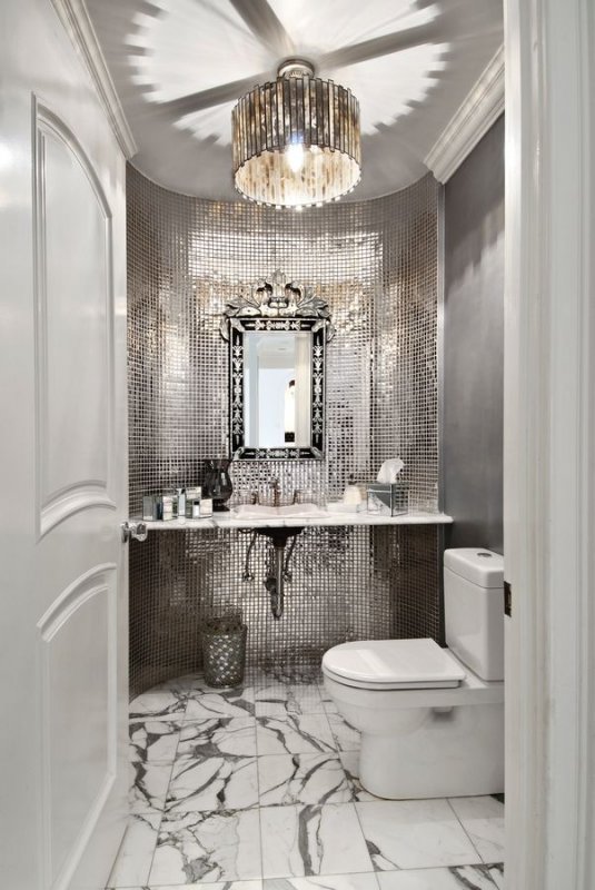 Темные помещения могут быть такими же элегантными, как и светлые. Но особенность гламурного стиля заключается в яркости и необходимости в большом пространстве с высокими потолками. Тем, у кого нет навыков оформления темных помещений, советуют создать насыщенное естественное и искусственное освещение. Стиль не ограничивает разнообразие осветительных приборов. Светильники размещают произвольно, в зависимости от функциональной необходимости. Если выбор остановился на темном фоне с приглушенным светом, делить пространство визуально будет сложнее, зато появится возможность для создания легких акцентов. Насыщенное освещение на фоне темных или светлых стен заставит задуматься над выделением уголков с полумраком, что даст больше опций для дизайнерских приемов. Свет может быть как рассеянным, так и направленным («галогенки», софиты).