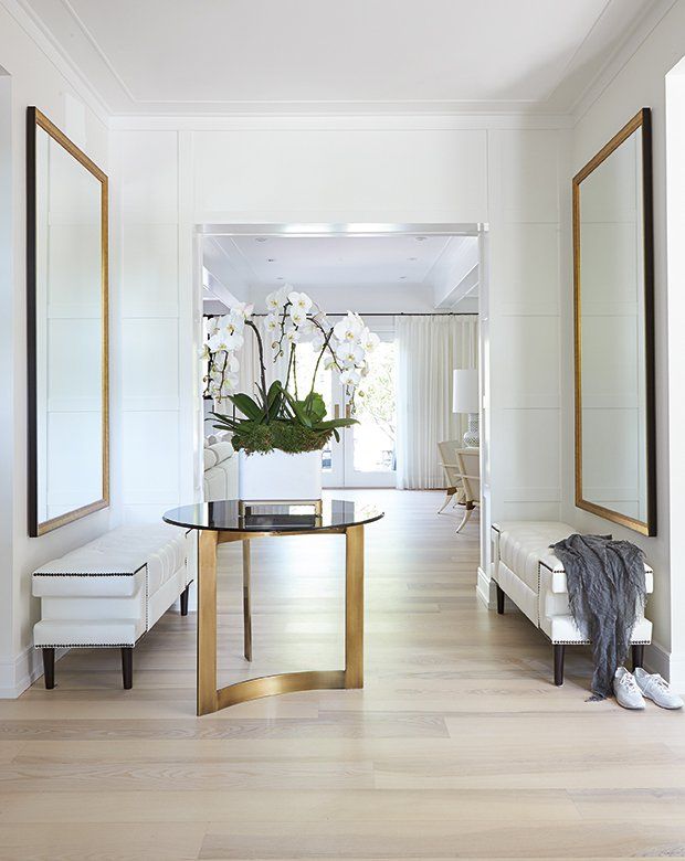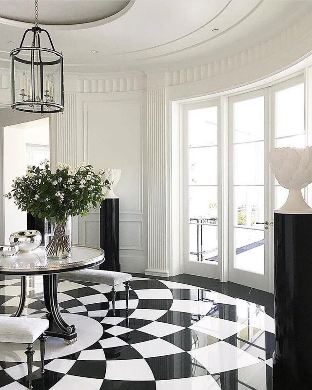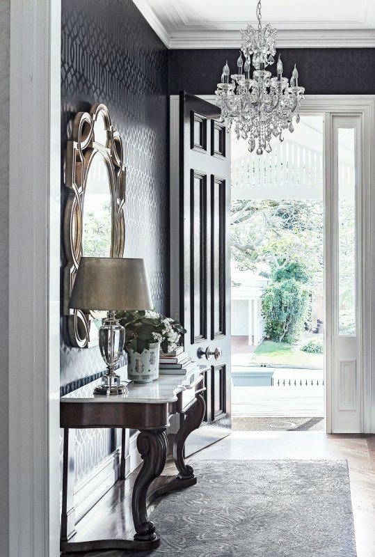 Для того чтобы стиль оформления идентифицировался с первого взгляда, нужно уделить внимание отделке прихожей. Это может быть длинный коридор или квадратное помещение. Необходимо наличие небольшого диванчика с дорогой обивкой. Главным украшением прихожей является модульная система. Приветствуется декорирование элементами из натуральной кожи или кожзама. Помещение можно обставлять большим количеством зеркал. Прихожую иногда оборудуют дополнительными полками для размещения небольших модных деталей. Освещение делается насыщенным, допустимо использование подсветки разных цветов. Прихожая может переходить в гардероб, и в таком случае лучше создать одно общее пространство. Наличие ковра в помещении необязательно. Пол стоит выполнить в интересных цветовых сочетаниях. Предпочтительно, чтобы на нем был узор.