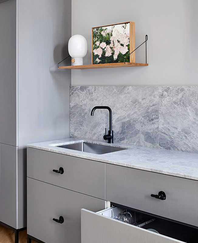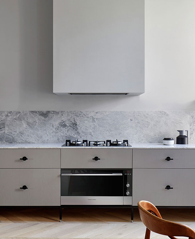 Каменная кухонная столешница длиной 4,5 метра обеспечивает достаточное пространство для приготовления пищи. Кухонные ящики распределены равномерно с обеих сторон плиты ради пропорциональной симметричной эстетики. Встроенная посудомоечная машина находится между духовым шкафом и раковиной, а вытяжка выкрашена в цвет фасадов для того, чтобы не отвлекать внимание.