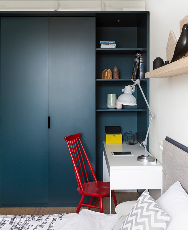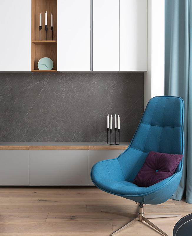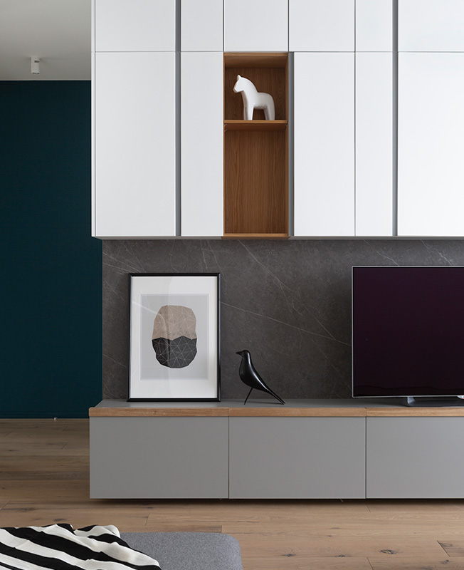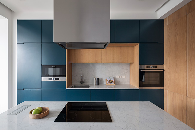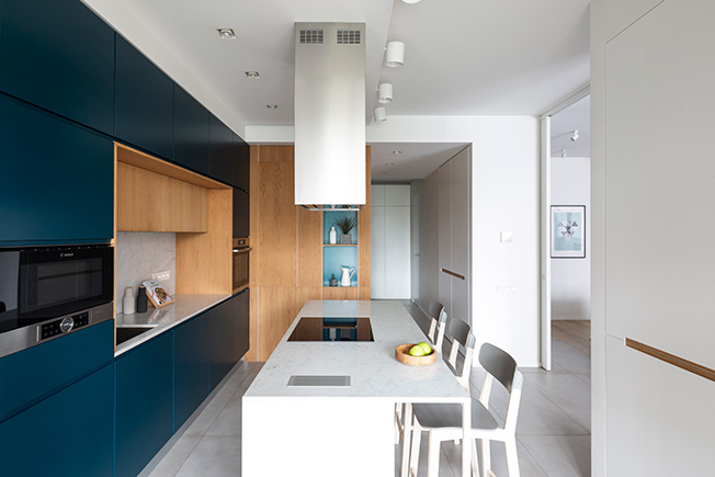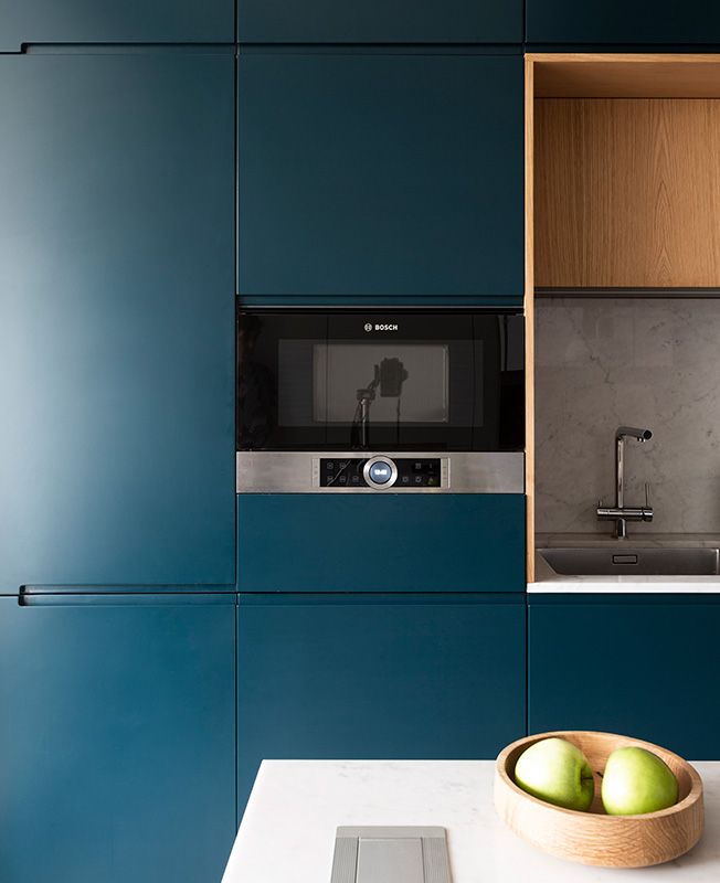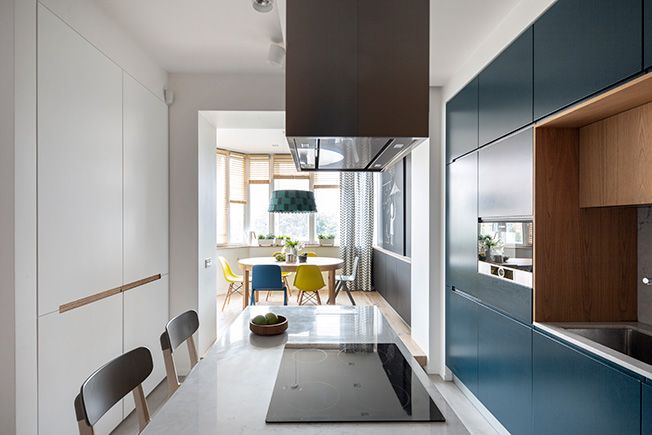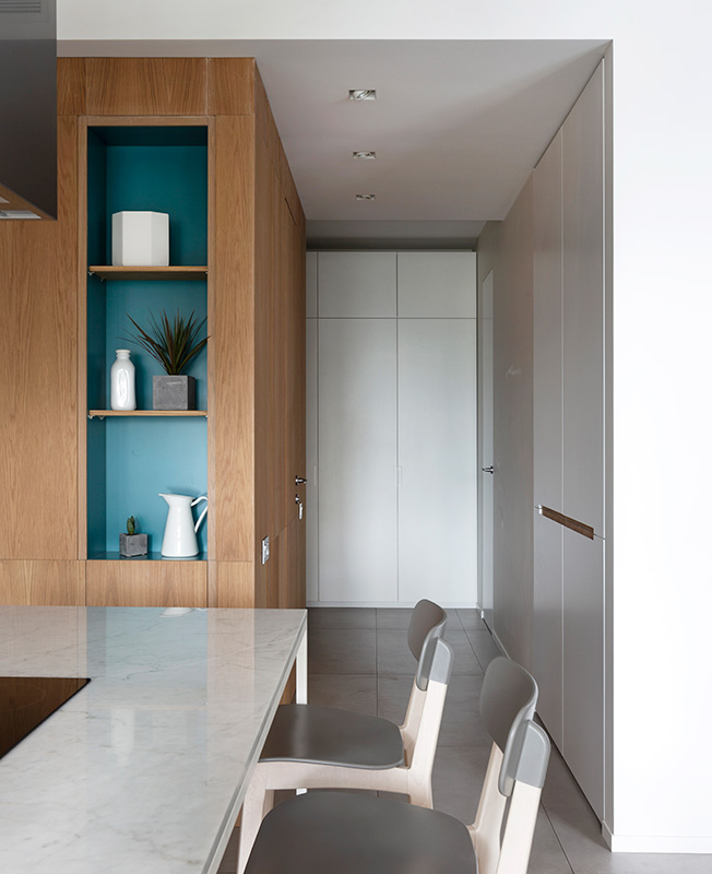 Фоном для насыщенных красок стали белоснежный и оттенок светлого дуба. «В целом все стены в квартире белые, цветовыми акцентами в каждой комнате является встроенная мебель. В изначальной концепции все цветные элементы были графитовыми, но клиенты немного боялись такого решения, поэтому графитового цвета остались только меловые фасады в зоне столовой. Тогда было принято решение ввести палитру сине-зеленых оттенков, но сделать их глубокими, чтобы идея графичности осталась.