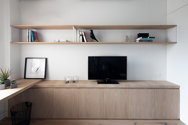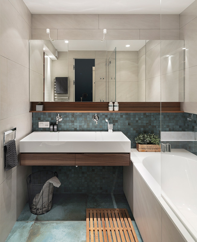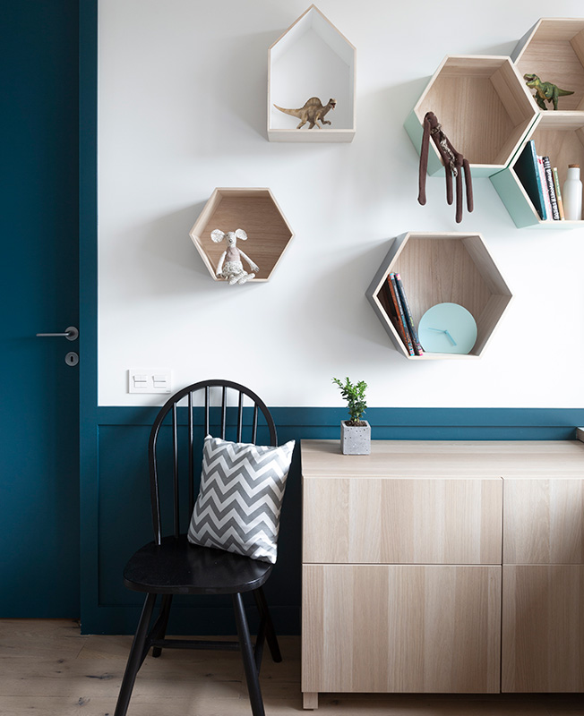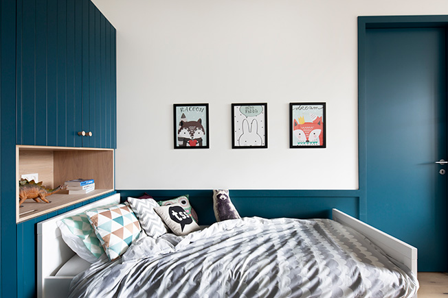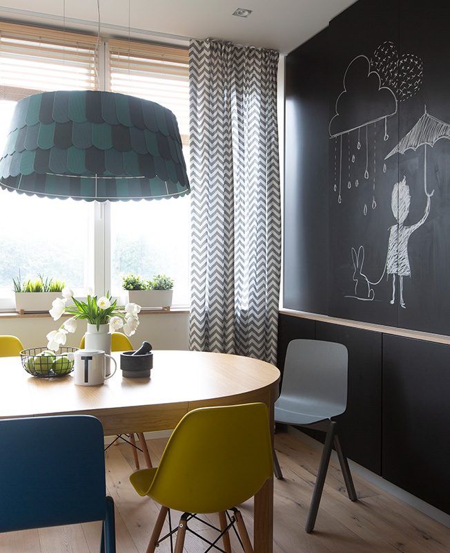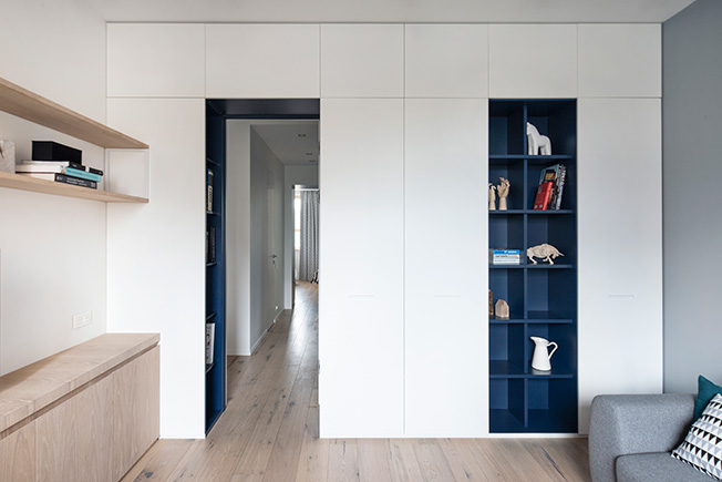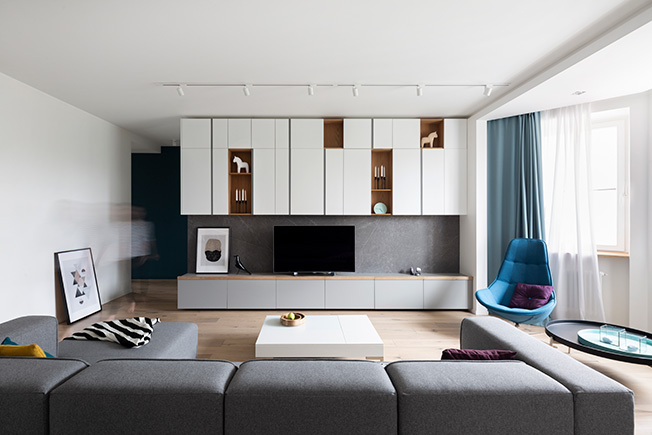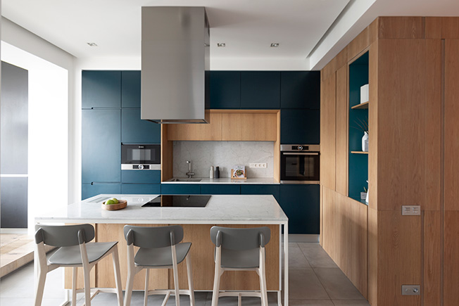 Фоном для насыщенных красок стали белоснежный и оттенок светлого дуба. «В целом все стены в квартире белые, цветовыми акцентами в каждой комнате является встроенная мебель. В изначальной концепции все цветные элементы были графитовыми, но клиенты немного боялись такого решения, поэтому графитового цвета остались только меловые фасады в зоне столовой. Тогда было принято решение ввести палитру сине-зеленых оттенков, но сделать их глубокими, чтобы идея графичности осталась.