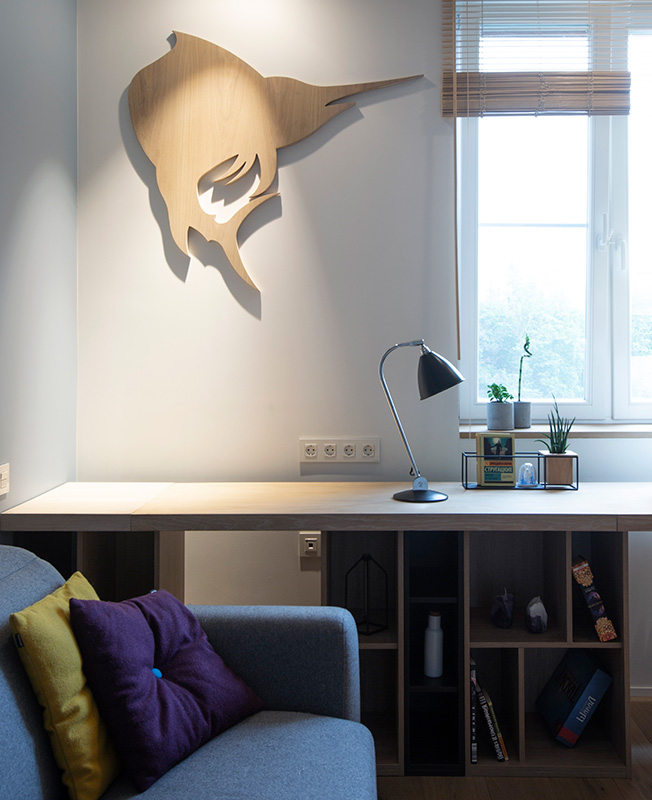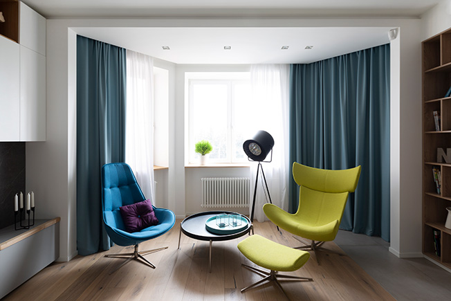 Строгих ограничений по стилистике от заказчиков не было, они просили современный яркий интерьер, комфортный для жизни. «Основной идеей было сделать чистое минималистичное пространство, но так как клиенты не хотели аскетичный монохромный интерьер, мы решили ввести в квартиру цветовые акценты в сине-зеленой гамме. В каждую комнату подбирали свой уникальный цвет, но при этом следили, чтобы они между собой сочетались и соответствовали настроению комнаты».