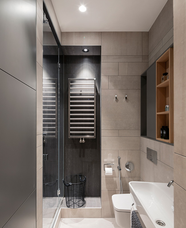 В основном все стены были под покраску, а часть стен закрыта стеновыми панелями. Объем, в котором находится гостевой санузел и постирочная, мы решили обшить деревянными настенными панелями. Это решение помогло скрыть утилитарную зону и выделить архитектурную форму в интерьере.