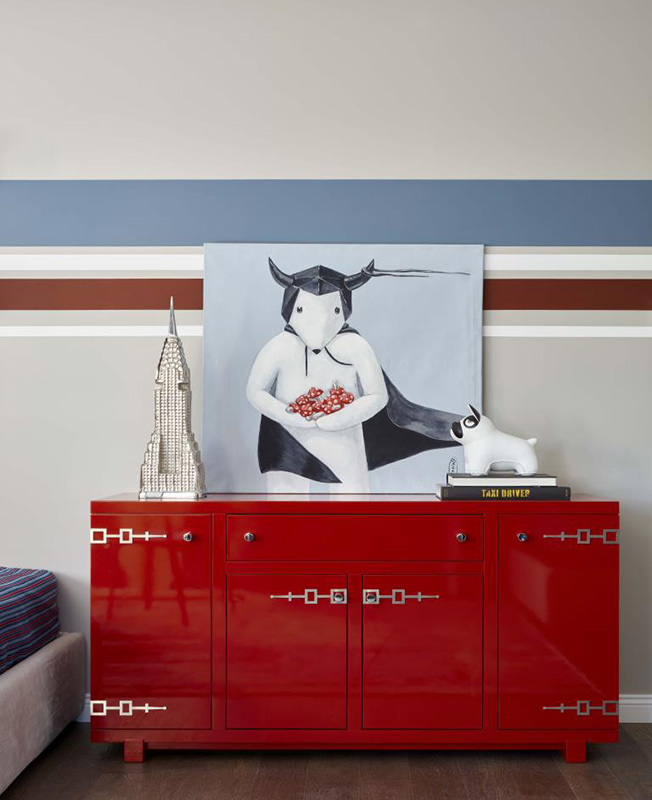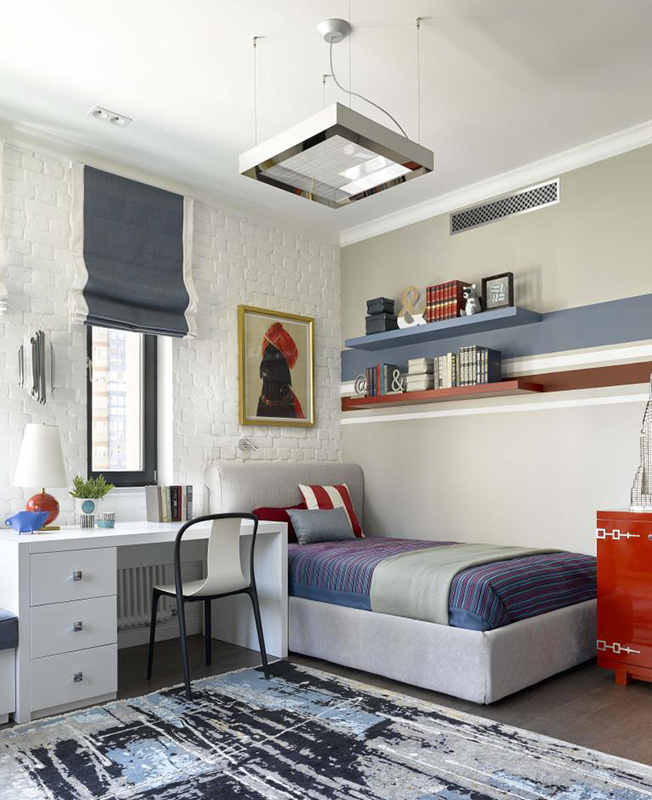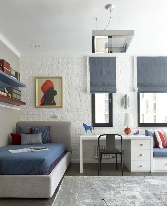 В детской для двух мальчиков-подростков мебель полностю выполнена на заказ в столярной мастерской. Ритм задают плоски на стенах (роспись) и в текстиле. Учитывая что комната рассчитана на мальчиков подростков было принято решение добавить брутальности в виде состаренного кирпича, а также люстры прямых четких форм. Иронии добавляют фотографии с собаками и работа московского художника, работающего под псевдонимом Krazki.