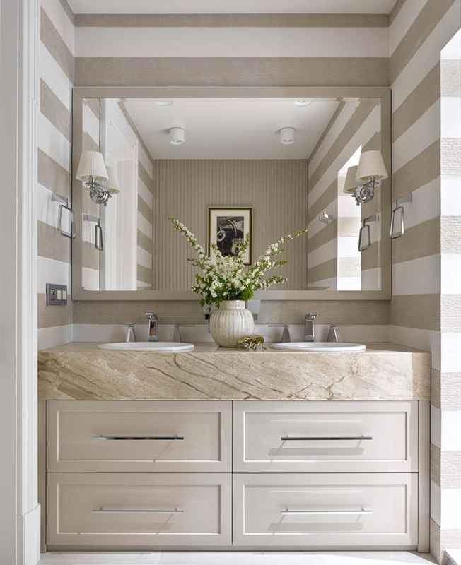 В ванной комнате установлены две раковины. Столешница выполнена из мрамора. Напротив зеркала расположена цельная панель, сделанная в столярной мастерской, ее фактура перекликается с полосатым керамогранитом, которым облицованы стены.»