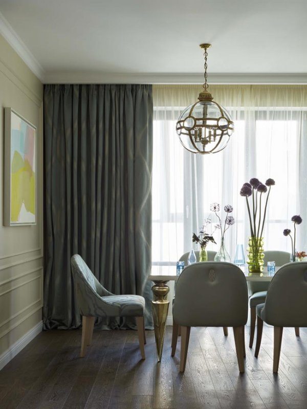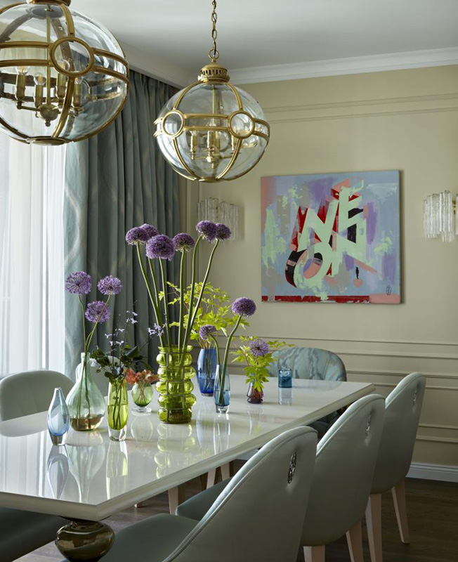 Cтол бренда Reflex выполнен из стекла. Его прозрачные опоры красиво преломляют свет. Стулья Opera Contemporary в тканях Rubelli и Sahco. Винтажные скандинавские вазы RetroNord. На стене работа Алексея Фланцевая.