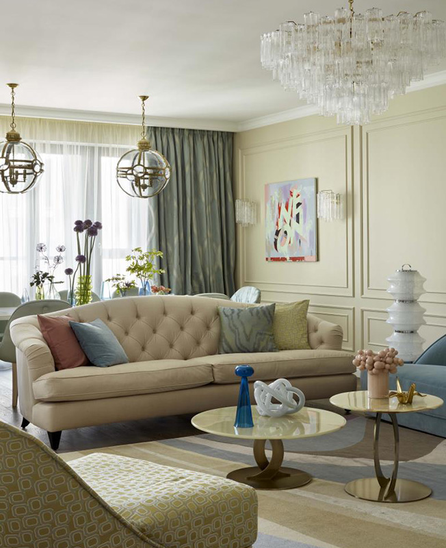 Работа Георгия Острецова вобрала в себя все оттенки, представленные в интерьере. Голубой диван Opera Contemporari в ткани Meridiani, столики того же бренда. Бежевый диван Soft House в ткани Houles.