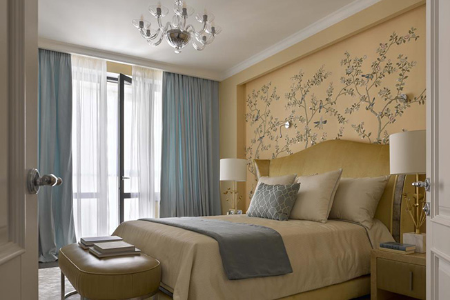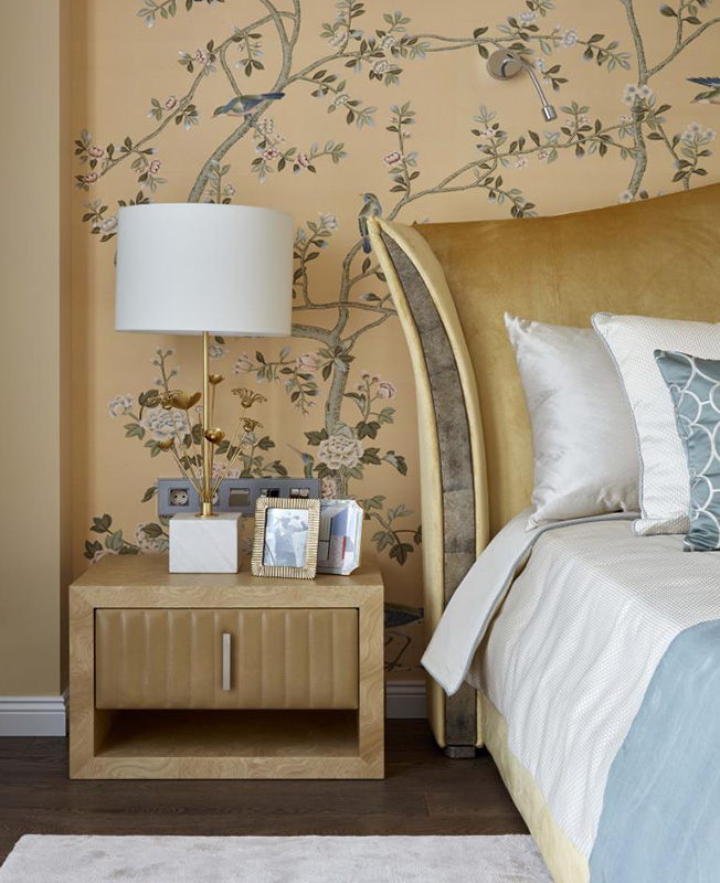 Для спальни была выбрана тема райского сада, которую иллюстрируют обои ручной работы de Gournay. Классическое сочетание охристых и голубых оттенков в сочетании с латунными настольными лампами придают уюта и тепла.