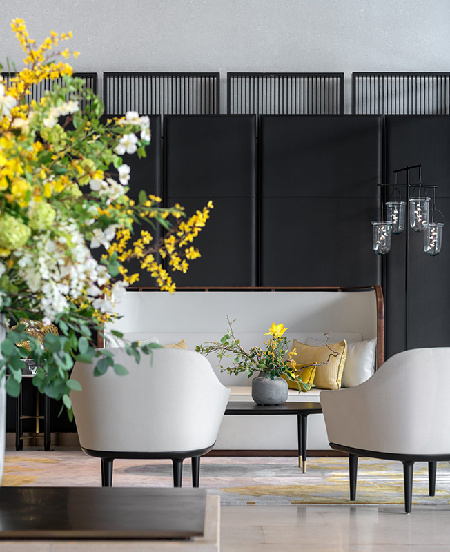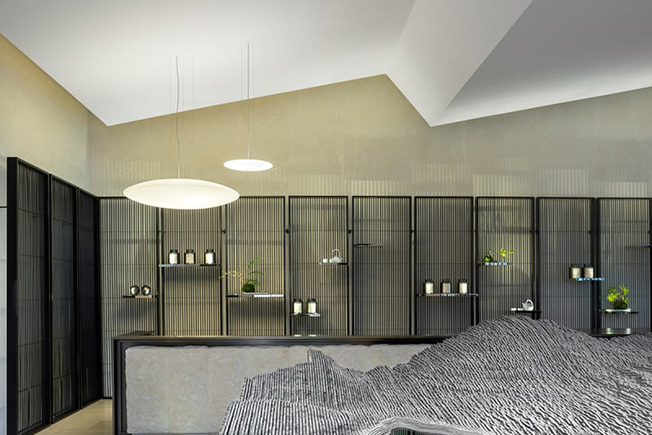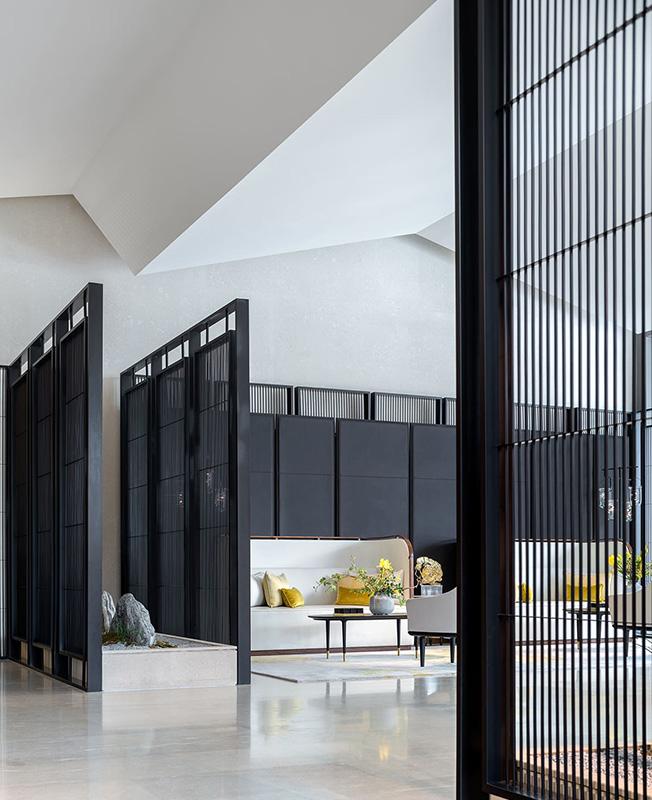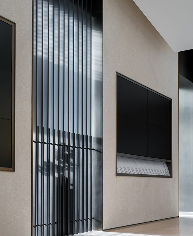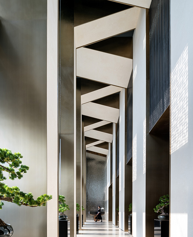 Мы спроектировали серию арок (вдохновленных живописью китайских крыш), которая отвечает ритму архитектурного фасада. На южной стороне ритм усиливается рядом колонн, одетых в контрастный темный металл и светлый текстурированный известняк. Каждый отсек позволяет просматривать перспективу сквозь слоистые лаковые перегородки».