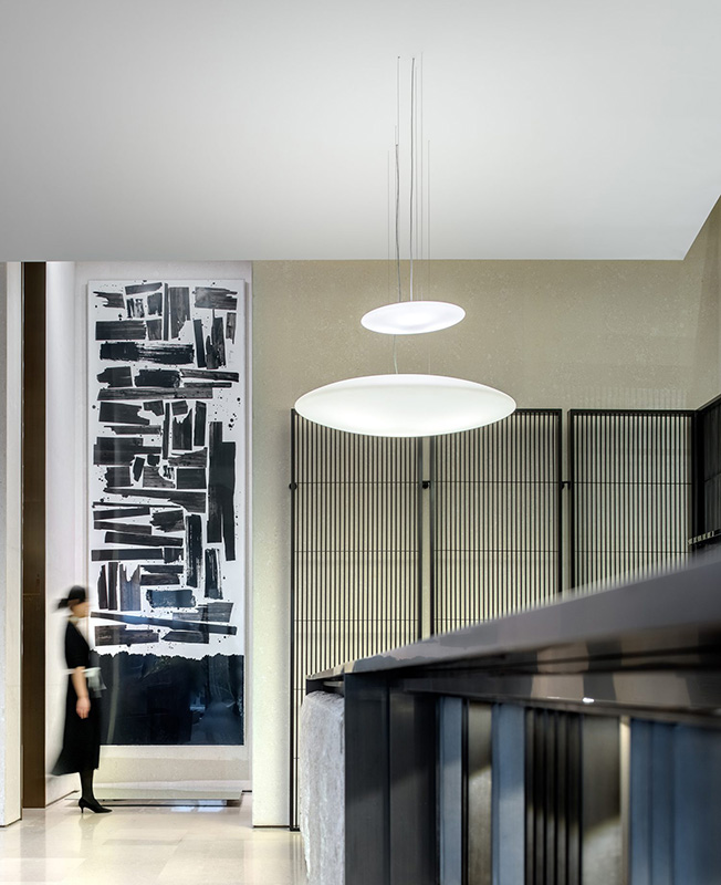 «Мы столкнулись с тем, что входная зона — это двухуровневое пространство внушительного размера. Как сохранить энергию дизайна? Наше решение состояло в том, чтобы продолжить «тему крыш», но в гораздо большем масштабе. Мы создали движение, вдохновленное водной рябью. По мере того, как оно достигает «зоны консультаций», волна становится симметричной.