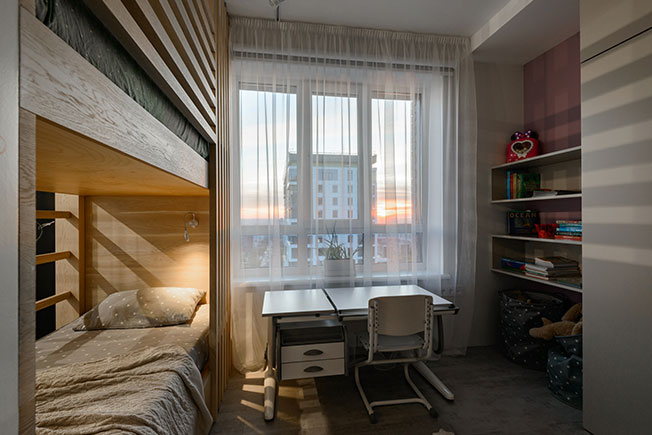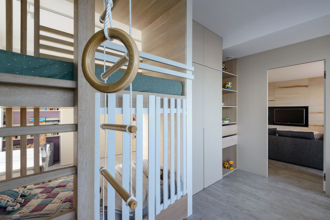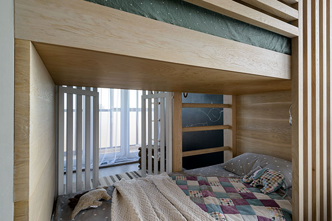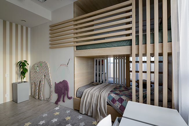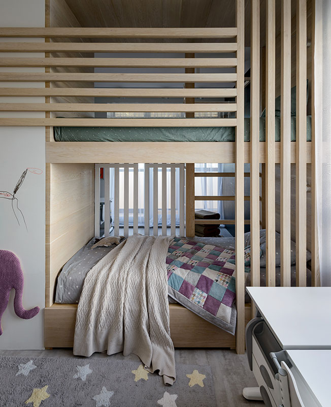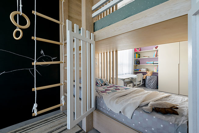 В детской решили сделать двухуровневую кровать: теперь дети могут лазать по ней и перебираться друг к другу в гости.