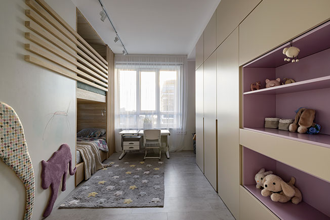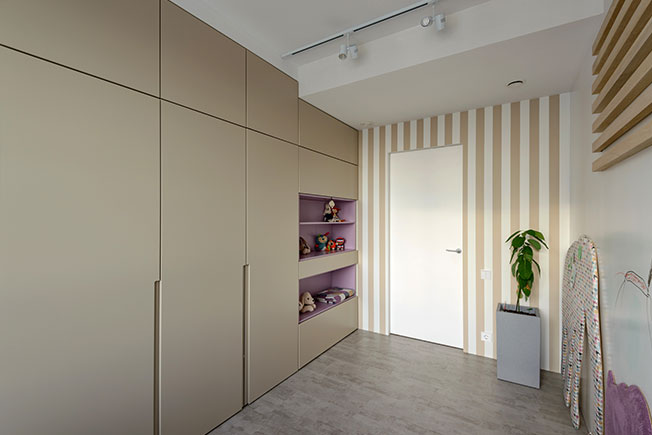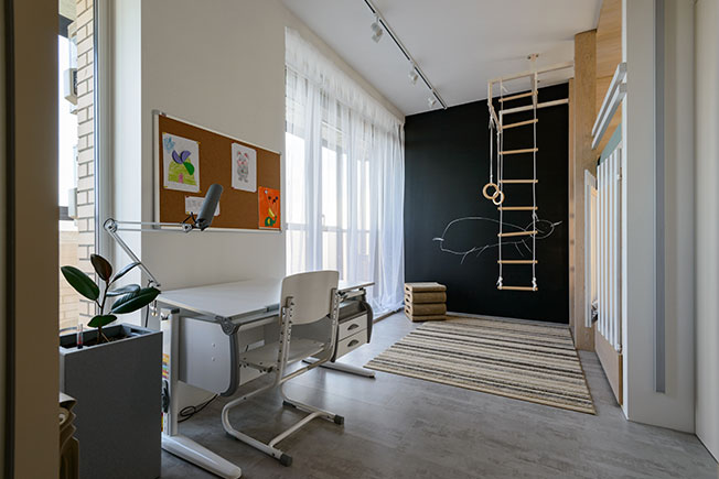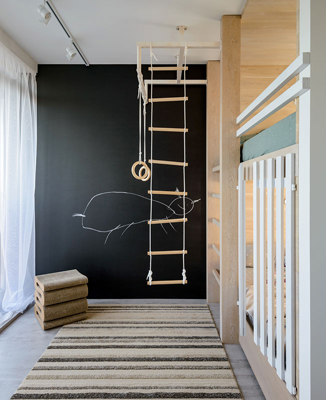 Забавный случай произошел за пару дней до съемки объекта: я попросила детей что-то нарисовать на стенке, покрытой специальной маркерной краской, чтобы внести больше жизни в интерьер. Ребята смело разрисовали всю стенку, не сильно думая — ведь с маркерной краски все легко стирается.