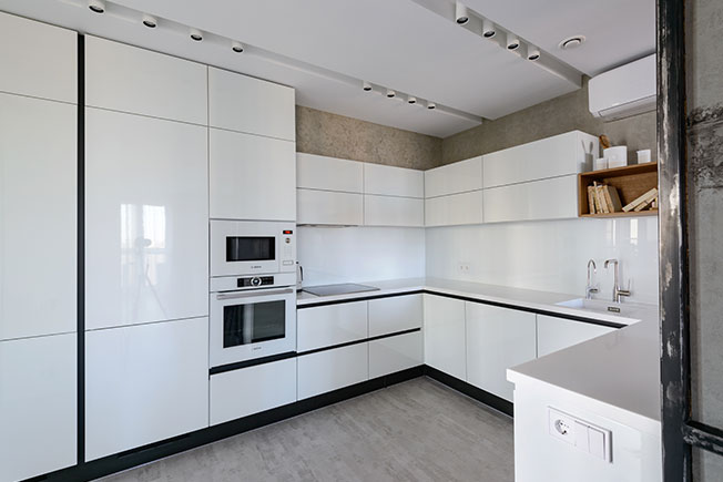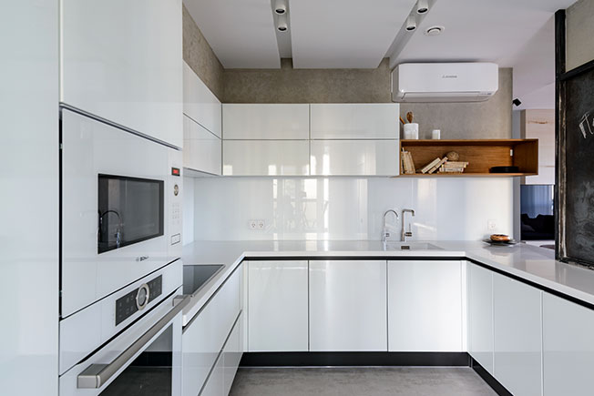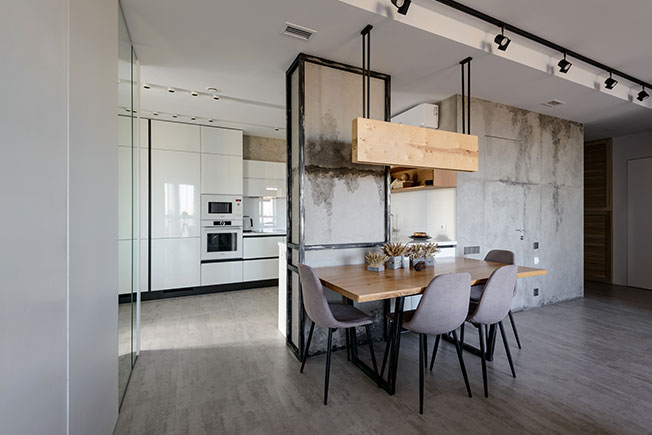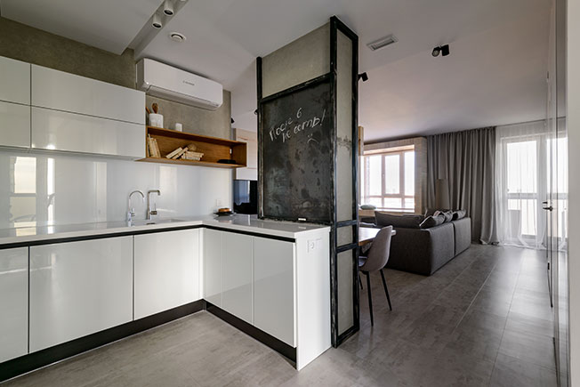 Колонн в этой квартире много, они тоже создавали некоторые проблемы в планировке. Кухня буквой «п» вписалась в «межколонное» пространство. На пограничной части кухни и гостиной установлен зеркальный шкаф для хранения пылесоса и других крупногабаритных предметов.