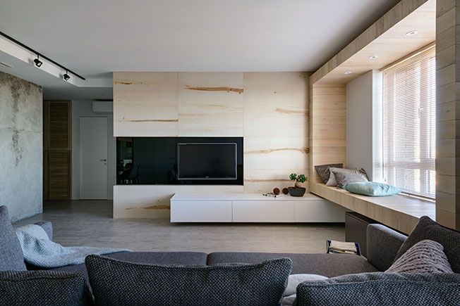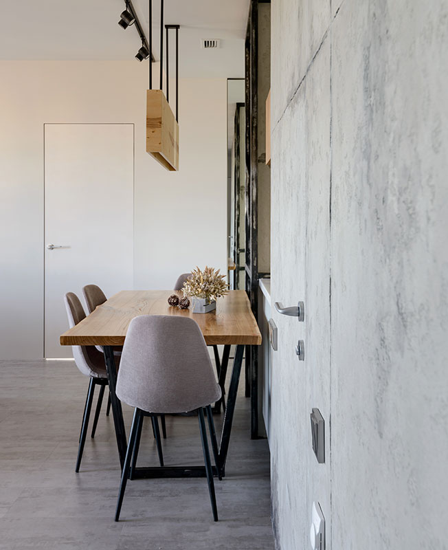 Ключевым элементом в гостиной стал портал вокруг окна — для уютных посиделок на подоконнике с видом на красивый парк. Заказчица сразу обрисовала и цветовую палитру: она любит белые стены и бетон, но просила разбавить это сочетание чем-то теплым и уютным.