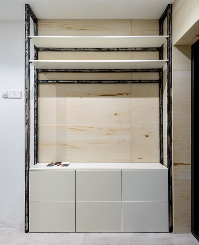 Далее по коридору был спроектирован хозяйственный шкаф с перфорированными дверцами, в нем спрятаны стиральная машина, водонагреватель, сушка.