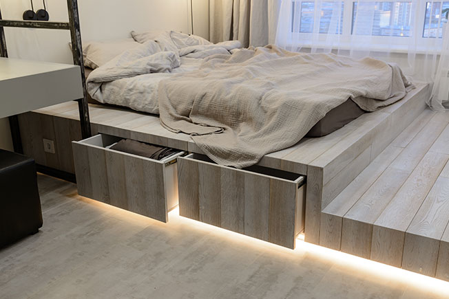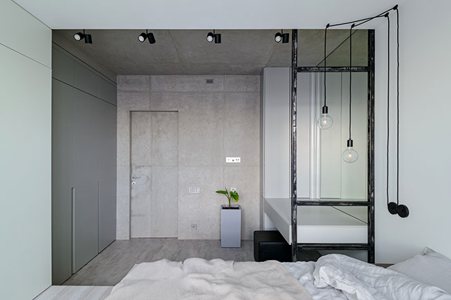Из-за небольшой площади спальни в ней решили соорудить подиум и положить на него матрас. Опять же — это удобное место хранения: два выдвижных ящика под белье плюс скрытый люк под матрасом.