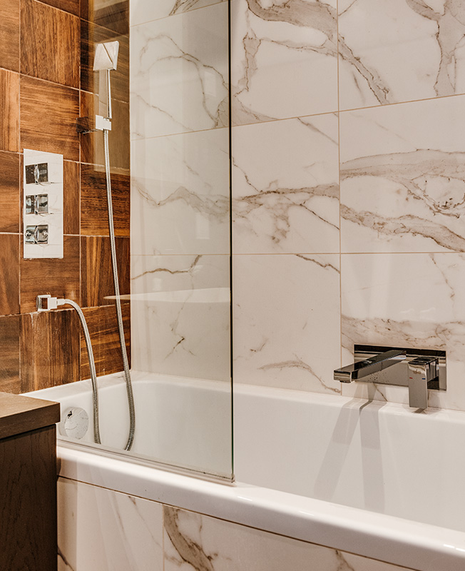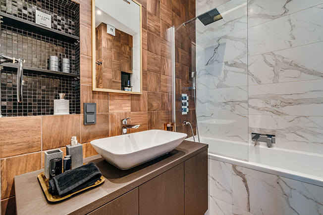 На кухонном фартуке был использован искусственный камень и серое тонированное зеркало. Стены и потолок в кухне-гостиной и кабинете покрашены английской краской Paint&Paper Library (компания была создана известным экспертом в области колористики Дэвидом Оливером), цвет назывался Leather, само название определяет его как очень теплый и комфортный.