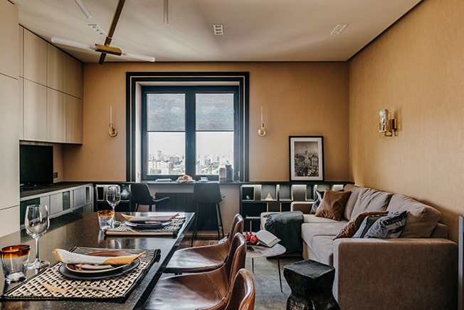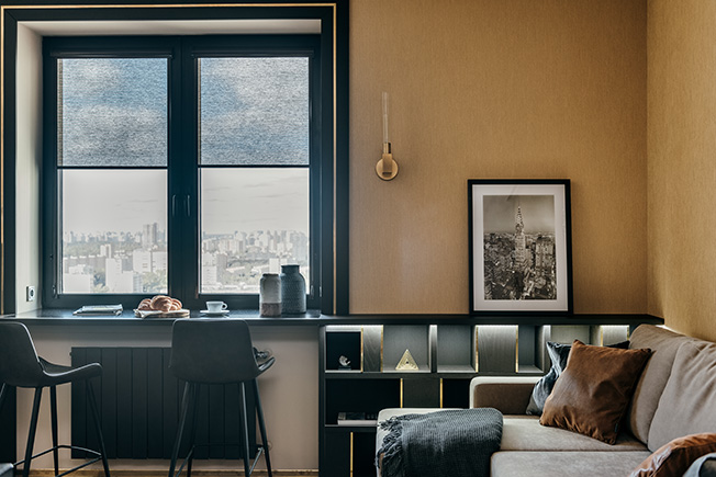По колористической гамме я решила продолжить в интерьере тему золотых отблесков закатного солнца, сделать квартиру по ощущению теплой, чтобы даже в дождливый день она не была серой и холодной. В гостиной использовала обои карамельного оттенка с тиснением: когда вечером на них попадают лучи заходящего солнца, они подсвечиваются золотом. Тему золотых отблесков поддерживают бра из латуни и латунные вставки в мебели. Сочетание темного матового шпона и глянца тонированного стекла добавляют пространству глубины.
