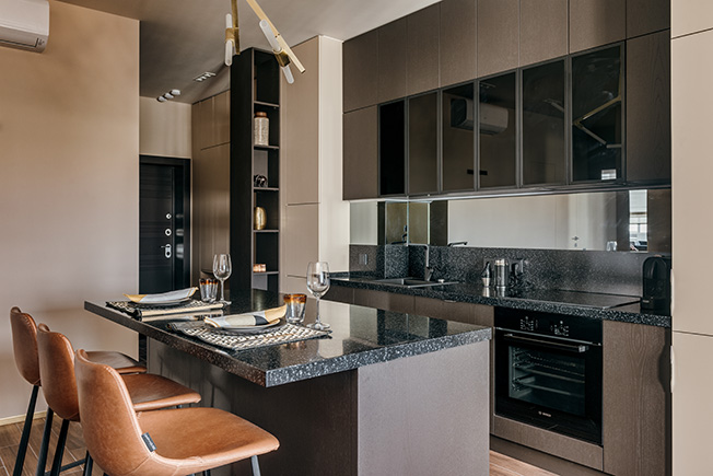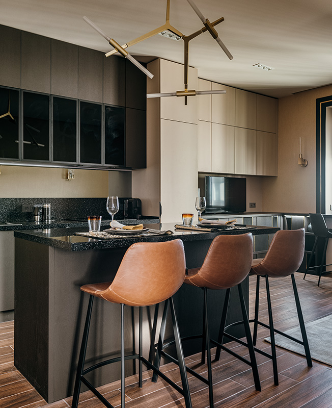 Квартира находится на 23 этаже, окна ориентированы на северо-запад, из них открывается прекрасный вид и виден закат. Это учли, проектируя кухню-гостиную: из подоконника мы сделали широкую столешницу, где можно за чашкой чая или кофе полюбоваться яркими красками заката. Центр композиции кухни-гостиной — кухонный остров. Заказчику он с успехом заменяет стол. Гости с удовольствием располагаются вдоль него и хозяин может спокойно готовить, не прерывая общение с ними.