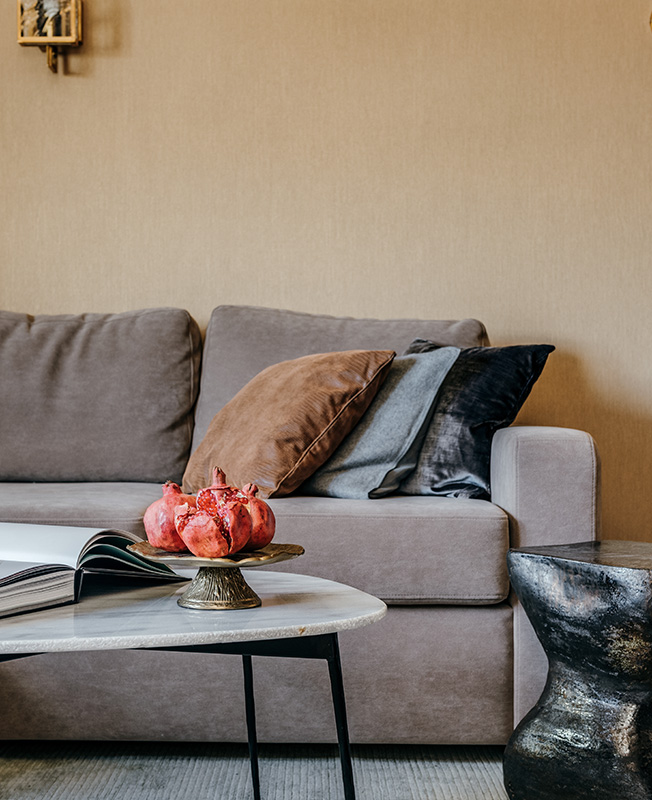 Вся встроенная мебель и часть отдельно стоящей была разработана по моим чертежам под этот проект, в том числе письменный стол в кабинете, консоль, прикроватная тумба. Вся система хранения в квартире встроенная. Один из примечательных предметов — керамический столик возле дивана от Savour: авторская керамика ручной работы. Их всего два.