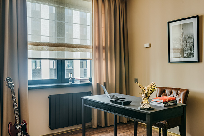 Никаких стилистических предпочтений он не высказывал, основное требование: интерьер должен быть комфортным, не холодным и не напоминать офис. Но упомянул, что у него есть любимая вещь — настольная лампа, которую он давно приобрел и она ему очень нравится: с абажуром из матового стекла на металлическом основании, дизайн 1940-х. Благодаря ей сложился образ интерьера — теплая палитра цветов с латунными вставками.