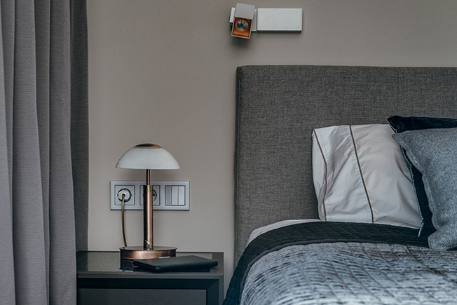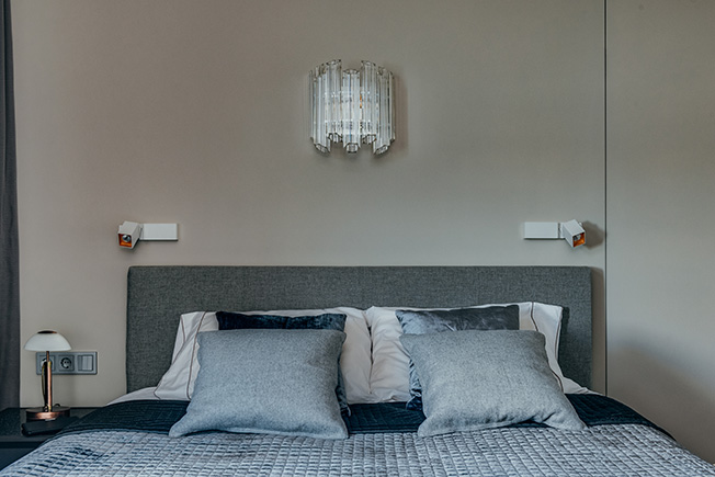 На стене за диваном и с окном — золотистые обои с фактурой, они как бы проводят лучи заходящего солнца в глубину квартиры. Вечером на них очень красиво ложатся тени от окна. Стены и потолок спальни покрашены английской краской Little Greene в серый нейтральный оттенок, там отдыхаешь от золотистой гаммы гостиной.