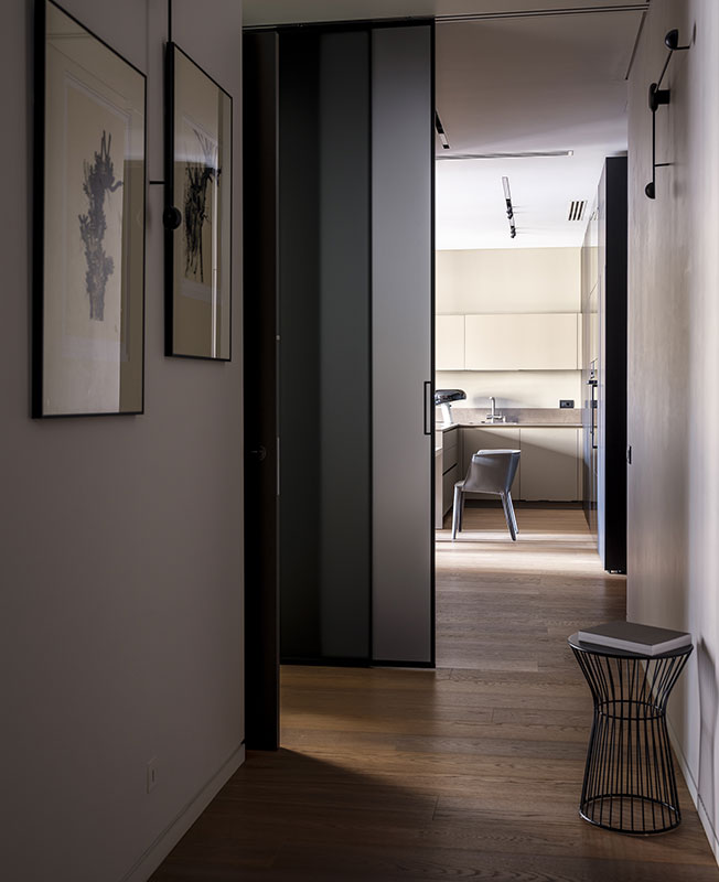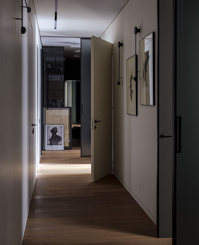 Зону хозяйской гардеробной и спальни также было решено не перекрывать глухими дверьми. Там я расположила раздвижные прозрачные перегородки Rimadesio, закрывающиеся только на ночь. Такие же перегородки установлены и в самом начале приватной зоны, чтобы при необходимости отделять ее от общей. Похоже немного на архитектуру японских домов, где раздвижные перегородки делят на ночь пространство на комнаты.