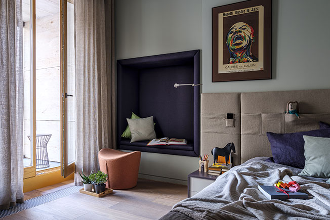 Комната сына. Для стен выбран прохладный бирюзовый цвет, который делает комнату больше. Обитая тканью ниша в стене и в изголовье кровати с тканевыми кармашками, компания Arte Domo. Кровать и тумба сделаны на заказ.