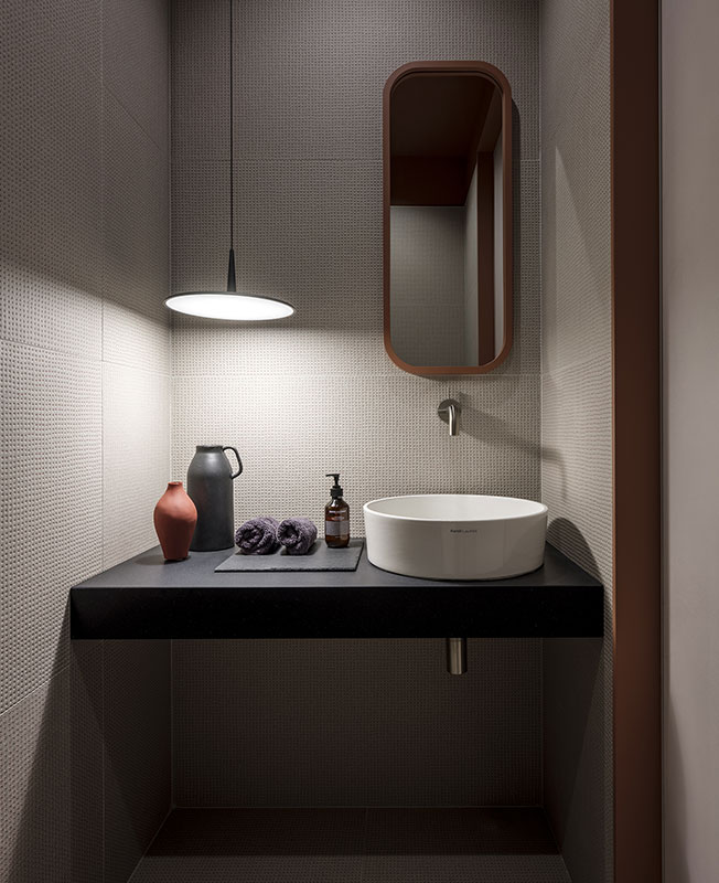 Гостевой санузел. Плитка, Mutina. Cветильник, Vibia. Раковина, Kartell by Laufen.