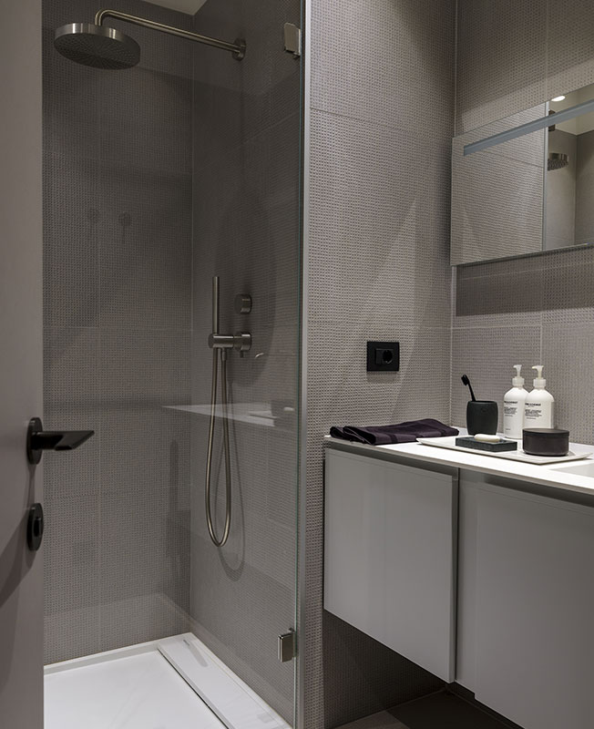 Одной из основных задач было визуально увеличить пространство и сохранить его цельность, а большое количество отделочных материалов могло бы разорвать его на части. Стены отштукатурены и покрашены. Одна из стен и двери в коридоре покрыты микроцементом, как и стена в гостиной. В санузлах я использовала керамогранит из коллекции Pico, дизайн братьев Буруллеков для Mutina.