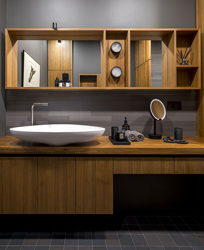 В хозяйской ванной комнате часть стен покрашена, а часть выложена керамогранитом из коллекция Mews, дизайн Barber & Osgerby для Mutina. В отделке ванной комнаты я использовала тик. Перегородки, мебель, вставки, — были сделаны на заказ.