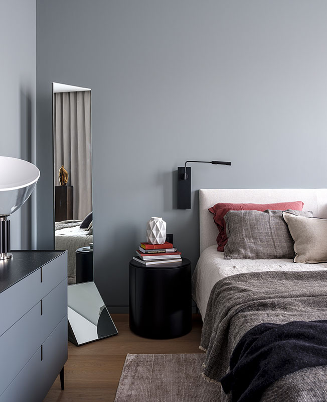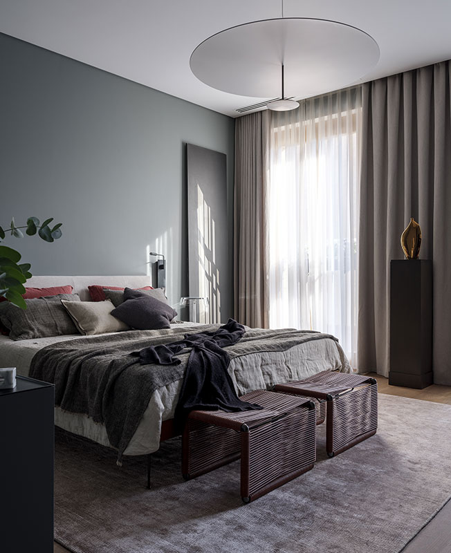 Основная палитра проекта — нейтральные цвета. Мне хотелось, чтобы видны были в первую очередь формы, материалы, фактура, архитектура, а не цвет. В квартире есть несколько помещений, выкрашенных в темные оттенки: это хозяйская спальня и ванная комната.