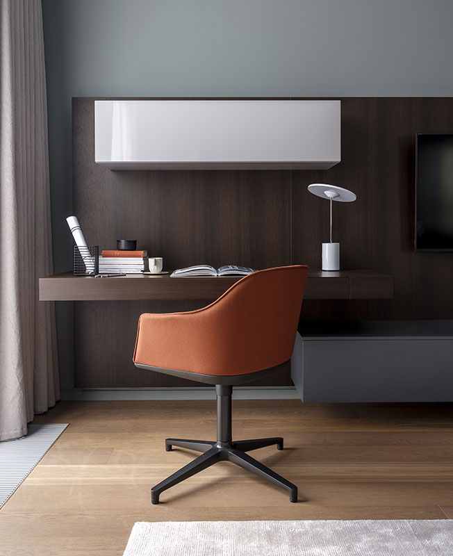 Зона кабинета в спальне хозяев. Мебельная композиция, Porro. Кресло, Vitra. Светильник, Artemide.