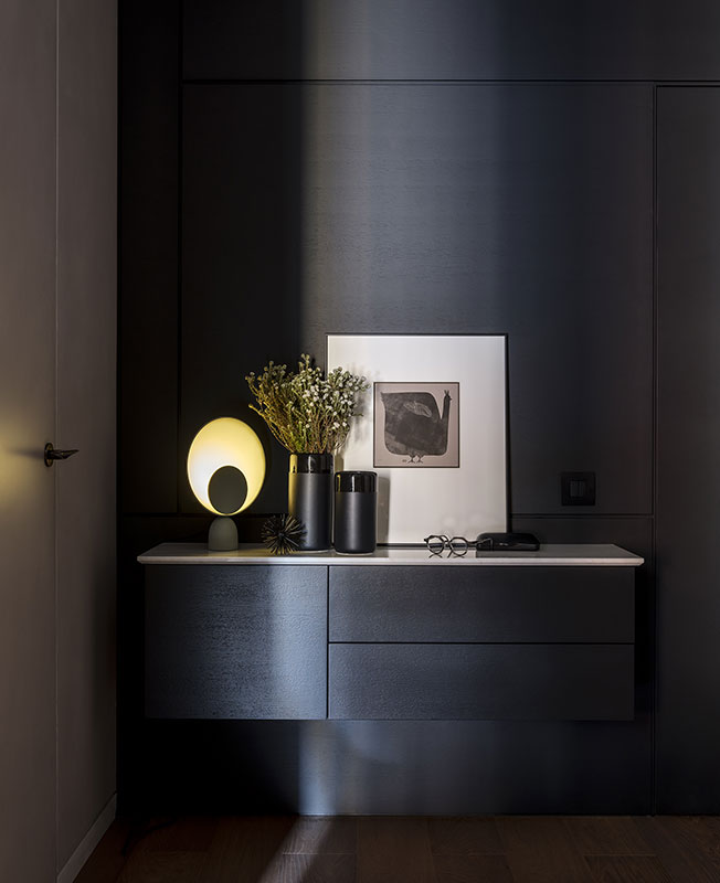 Для входной двери дизайнер предложила сделать биометрический замок, что оказалось невероятно удобно, а по дизайну он как нельзя лучше смотрится на черных панелях.