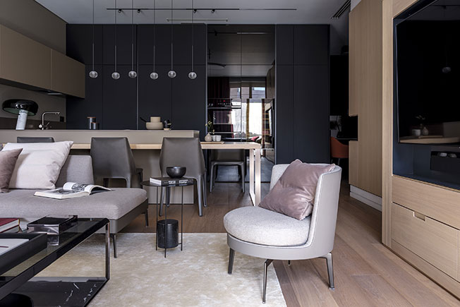 Кухонная мебель была спроектирована таким образом, чтобы находясь в гостиной не было ощущения, что ты — на кухне. Вся система хранения и кухонная техника с винным шкафом были выстроены в единую стену черного матового цвета с фрагментом из стекла.