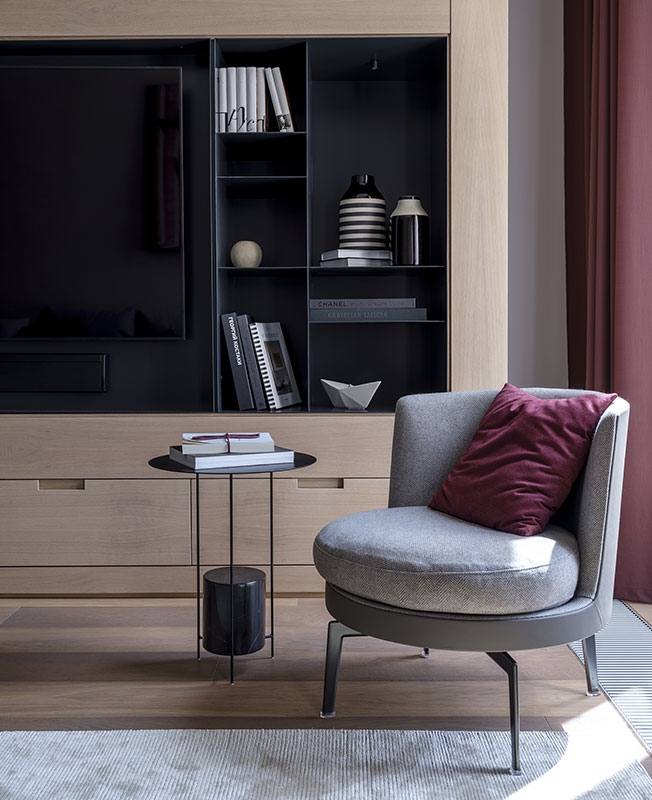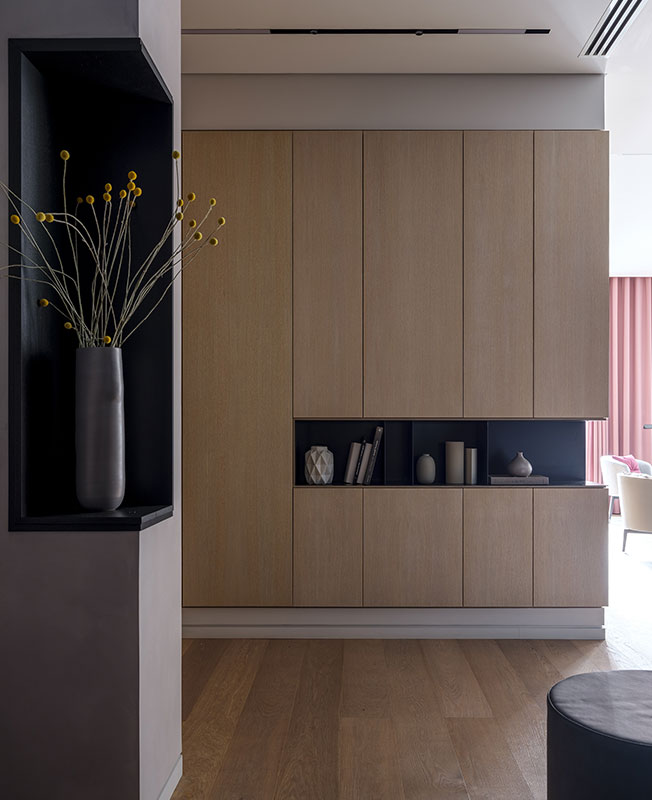 Также я старалась уйти от симметрии, которая больше подходит для классики. С асимметрией работать гораздо сложнее, но интересней. И результат совсем другой — динамичный. Это то, что нужно для современной квартиры, которая находится в центре большого города. Так же, как и в архитектуре самого жилого здания, я использовала игру выступающих объемов, продолжая ее в интерьере.