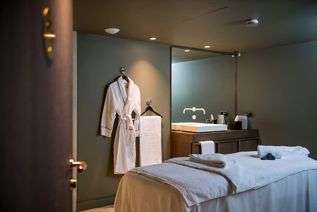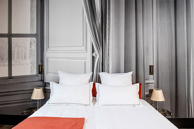 Стекло, латунь, дуб, фарфор, кессонные потолки, теплые цвета (красный, оранжевый, терракотовый) поддерживают оммаж королевскому зданию. Бесчисленные предметы декора выбраны для интерьеров Мари-Лор Жуссе, бывшим куратором дизайна в Центре Помпиду. Именно благодаря ей мы можем видеть в гостиничных стенах вещи Джоанны Гравундер, Этторе Сотсасса, Наото Фукасавы, Марселя Вандерса, Акилле Кастильони.