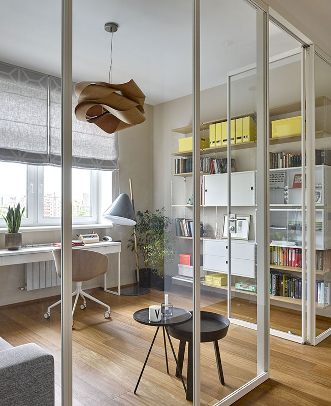 Благодаря прозрачной перегородке, свет из кабинета проникает в коридор. Столик Hay. Торшер и кресло Bolia, стеллаж String. Подвесной светильник из скрученного шпона LZF.