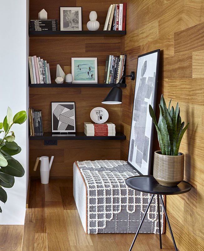Подиум отделяет графичную черно-белую прихожую от отделанной деревом гостиной. Стеллаж La Chance.