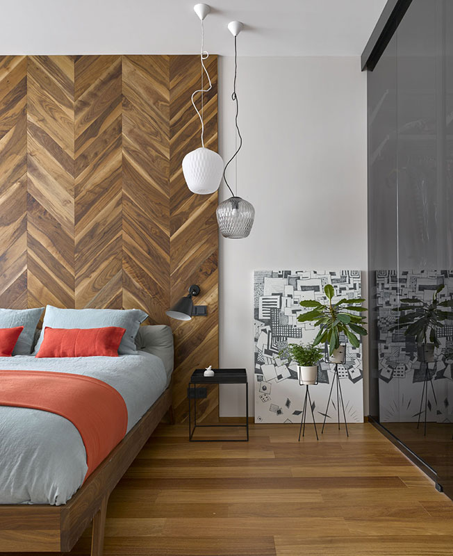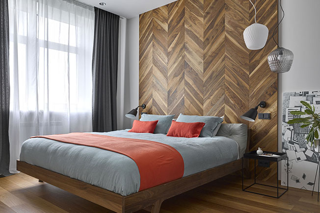 Спальня. Стена в изголовье отделана деревянными плашками, уложенными елкой. Выполнив пожелание заказчиков, авторы использовали в интерьере много дерева, но сделали это тонко и оригинально, так что нет ощущения его переизбытка.