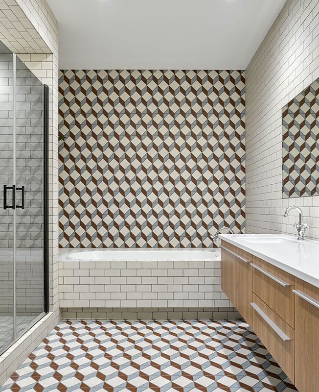 Керамическая плитка от компании Topcer демонстрирует активный орнамент в духе оп-арта, известный как «кубы Бине». Его разбавляет классическая белая плитка «метро».