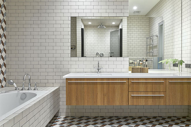 Керамическая плитка от компании Topcer демонстрирует актуальный орнамент в духе оп-арта, известный как «кубы Бине». Его дополняет классическая белая плитка «метро».